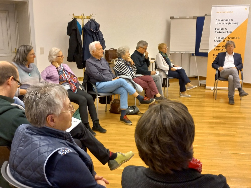 Durch den tiefsinnigen Vortrags- und Gesprächsabend führte die langjährige ehemalige Referentin des Bildungshauses Mariatrost, Ingrid Zechner, die Initiatorin dieser Veranstaltung. Kathrin Karloff, die Leiterin der Nachfolgeinstitution Bildungsforum Mariatrost, würdigte Ingrid Zechner für ihr mehr als 35-jähriges Wirken in der Erwachsenenbildung. Die Eröffnungsworte sprach Walter Prügger, Leiter des diözesanen Ressorts Bildung, Kunst & Kultur und des Bischöflichen Amtes für Schule und Bildung.