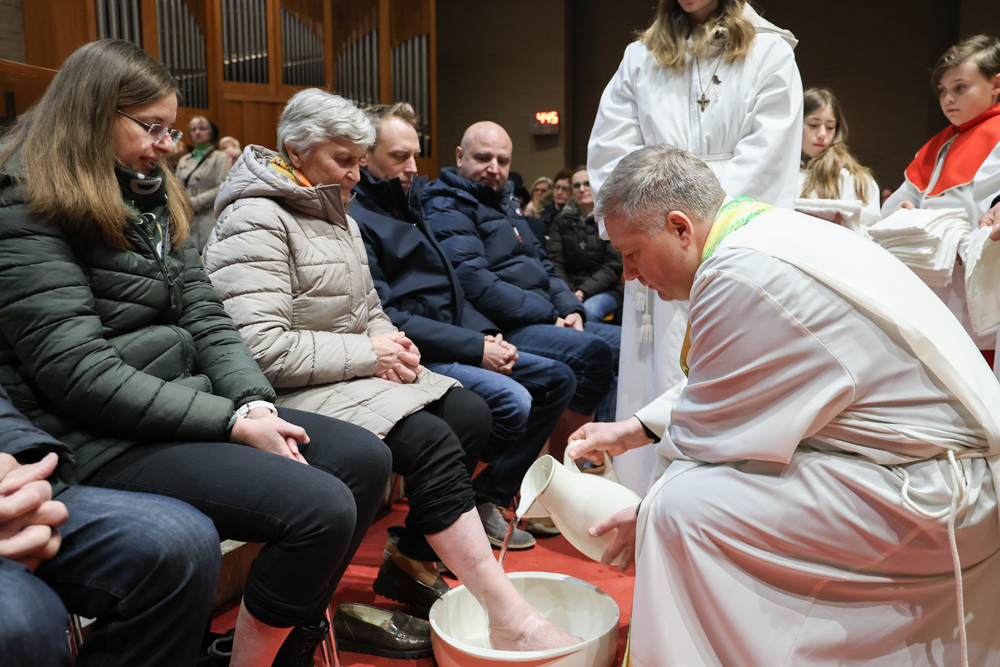 Bei diesem Mahl nahm Jesus das Brot, brach es, reichte es seinen Jüngerinnen und Jüngern und sagte: „Das ist mein Leib, der für euch hingegeben wird.“ Doch Jesus ging noch einen Schritt weiter: Er wusch die Füße seiner Freunde – nicht als Zeichen von Macht, sondern von Liebe und Dienstbereitschaft. Deshalb wurden stellvertretend zwei Personen jeder Pfarre von Pfarrer Claudiu Budău und Diakon Franz Habith die Füße gewaschen.