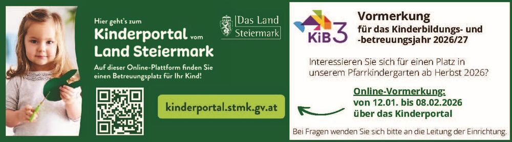 Die Vormerkung für das jeweilige Kinderbildungs- und -betreuungsjahr wird ab Mitte Jänner ausschließlich im Kinderportal des Landes Steiermark unter folgendem Link möglich sein: https://kinderportal.stmk.gv.at/
